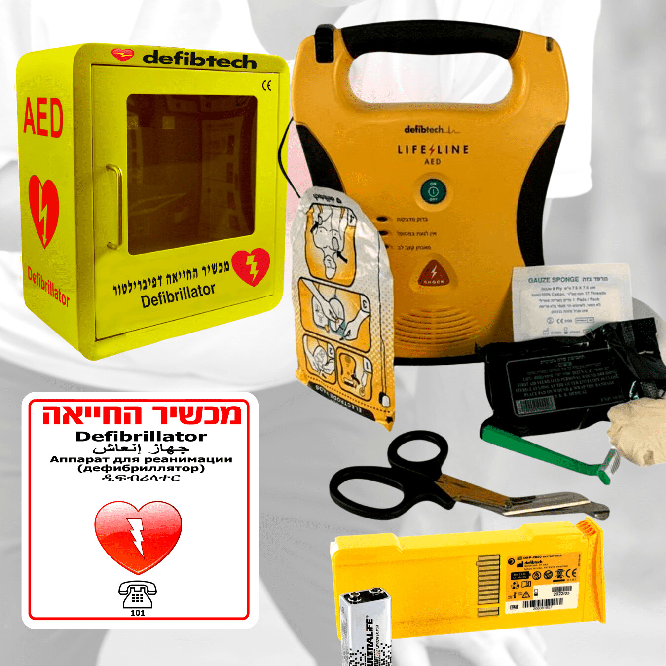 חבילת אבזור מקיפה לדפיברילטור אוטומטי דובר עברית Lifeline AED